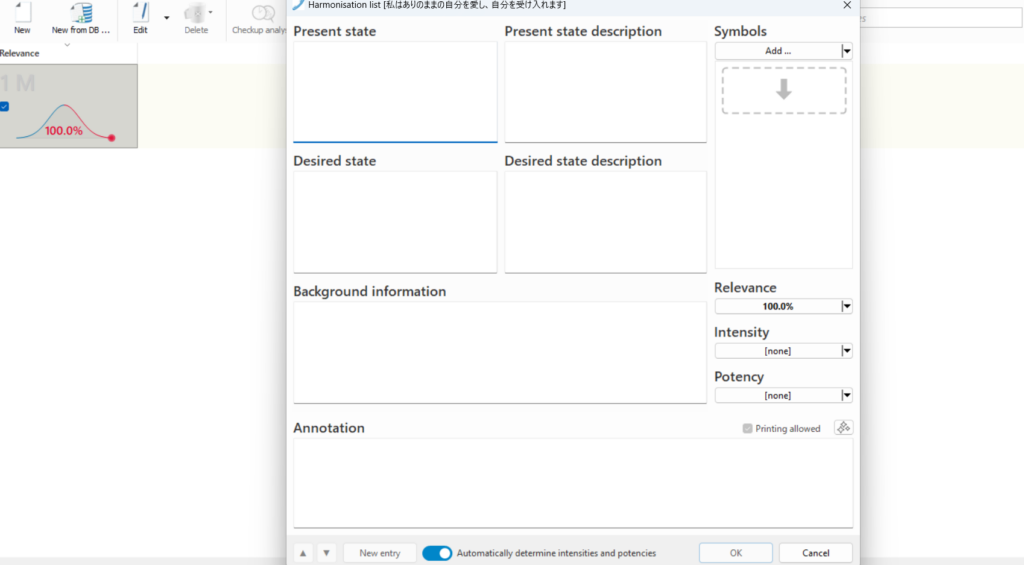 フォーカステキスト(目標や望む状態を短い文章にしたもの)を入力し、情報フィールドにアクセスして目標達成を阻害する要因を特定します。その分析結果を調整することができます。